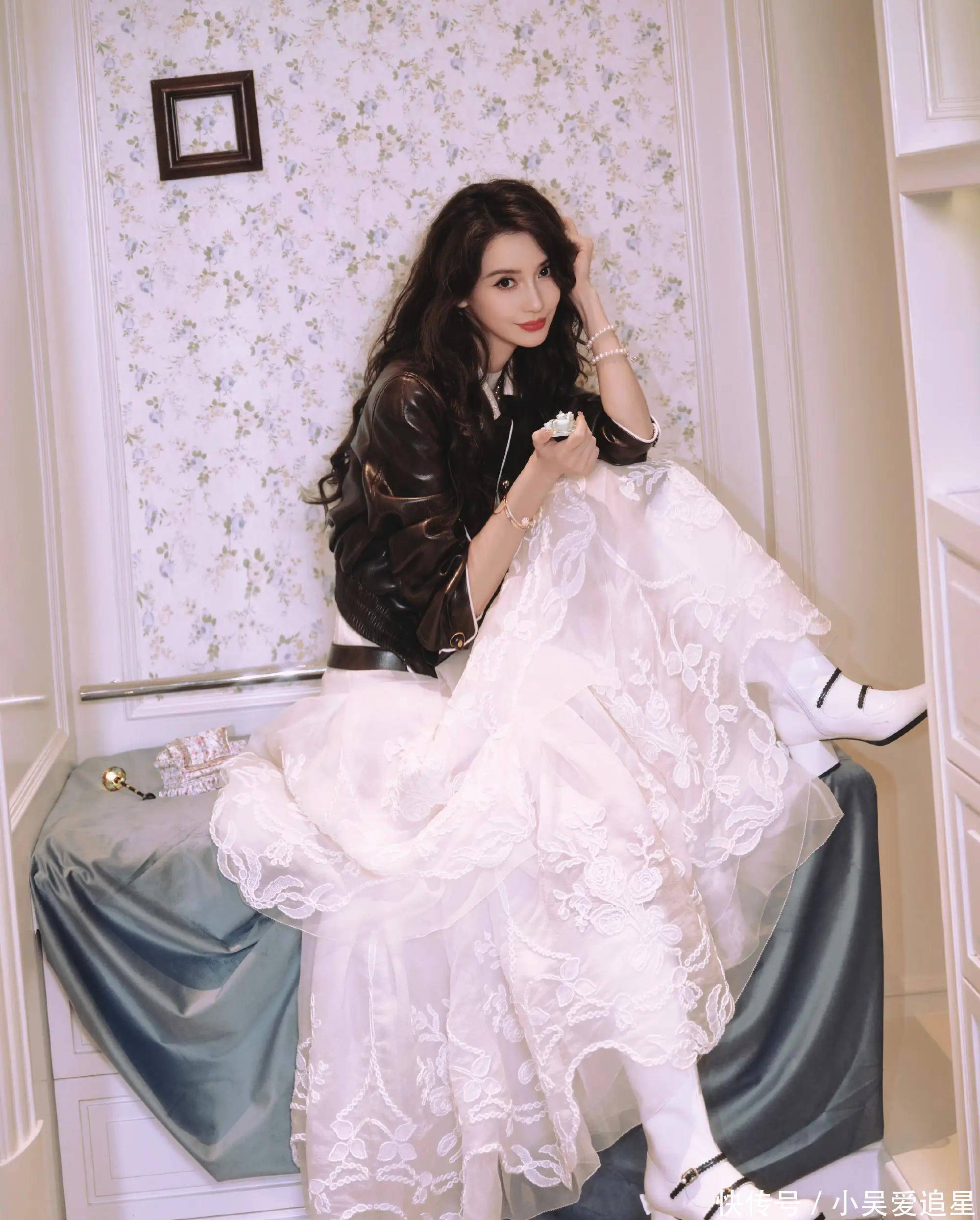 甜酷风今年杀出匹黑马Angelababy!棕白拼接皮夹克混搭蕾丝裙,硬朗里藏甜味,领口钉珠小花刚好中和机车风的飒。最妙的是她脚踩马丁靴却拎着珍珠包,粉丝狂赞:“甜酷天花板!机车少女和芭蕾名伶的基因被她拧一块儿了!”